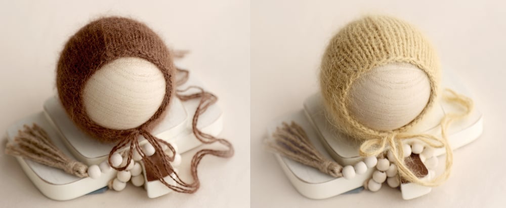 Luscious French angora bonnet (classic style) in beautiful mink brown and camel color. Newborn size.