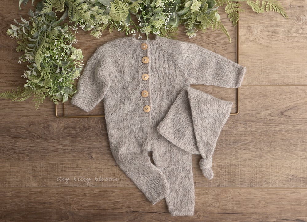 Cloud soft newborn sleeper and sleepy hat set. Knit from luxurious alpaca yarn. Perfect newborn photo prop or take-me-home outfit for babies under 14 days.