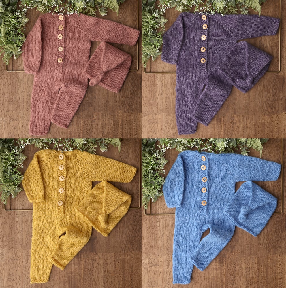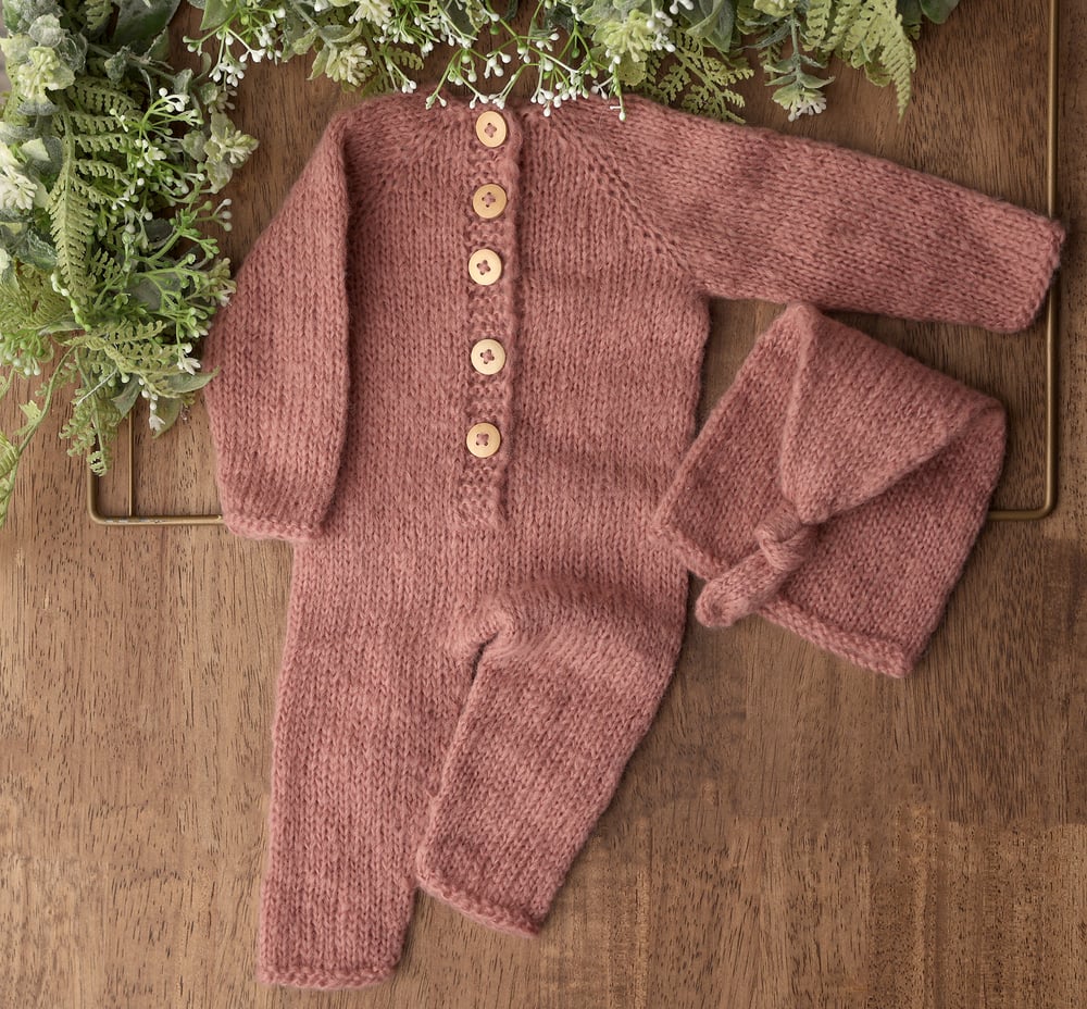 Cloud soft newborn sleeper and sleepy hat set. Knit from luxurious alpaca yarn. Perfect newborn photo prop or take-me-home outfit for babies under 14 days.