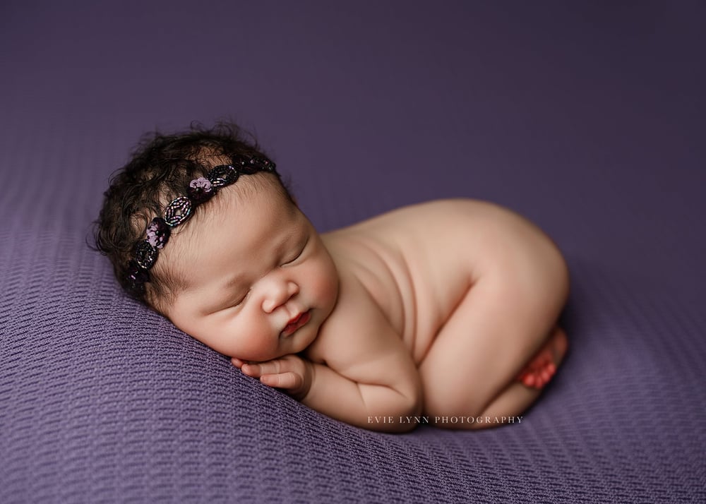 Exquisite beaded band featuring deep purple sequin flowers and iridescent beads. Newborn images by Evie Lynn Photography and L&I T Photography