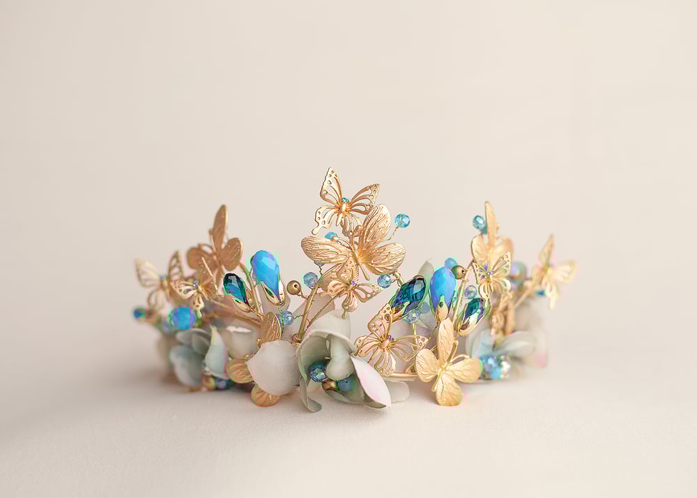 Stunning antique gold and turquoise crown adorned with gorgeous jewels, beads, floral and butterfly accents. Back of the crown is open and can be pinned or tied - diameter is approximately 6" and the base is pliable.