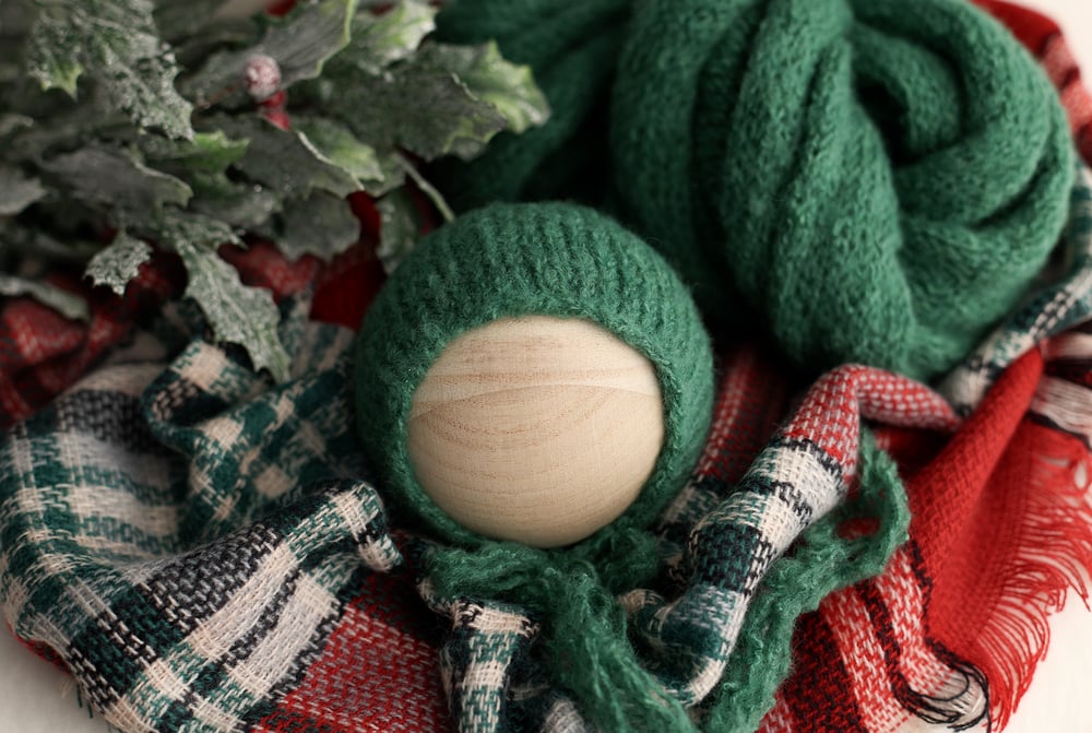 Super soft and stretchy brushed knit wrap (approx 15 x 55) and matching bonnet, paired with a complimenting plaid (non stretch) layer Care: hand wash and lay flat to dry